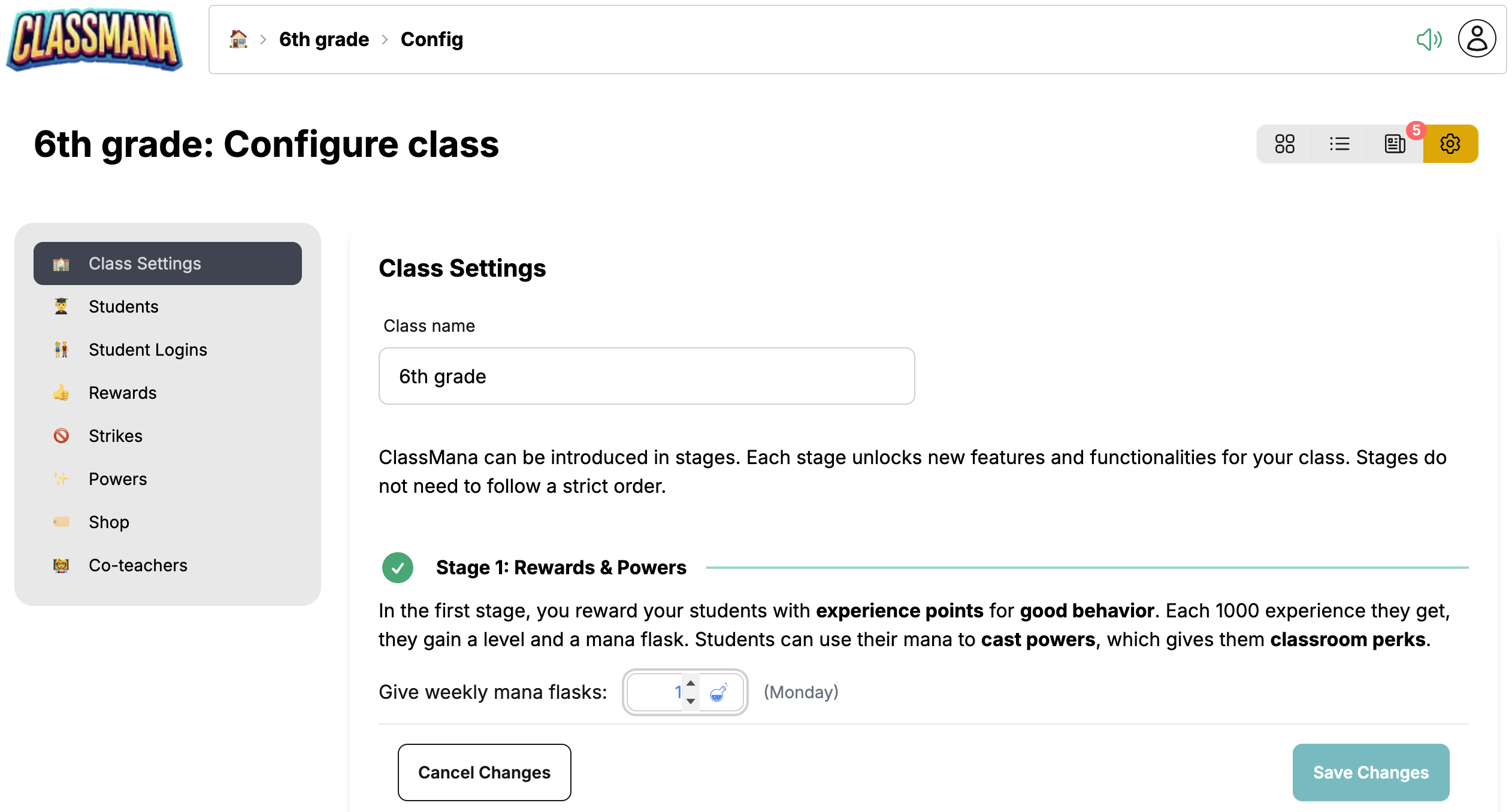 - posms ir ClassMana gamifikācijas sistēmas pamats. Jūs apbalvojat skolēnus ar pieredzes punktiem par labu uzvedību. Par katru 1000 nopelnīto pieredzes punktu skolēni paaugstina līmeni un iegūst 1 manu. Skolēni var tērēt savu manu, lai izmantotu spējas — īpašas klases priekšrocības un privilēģijas.