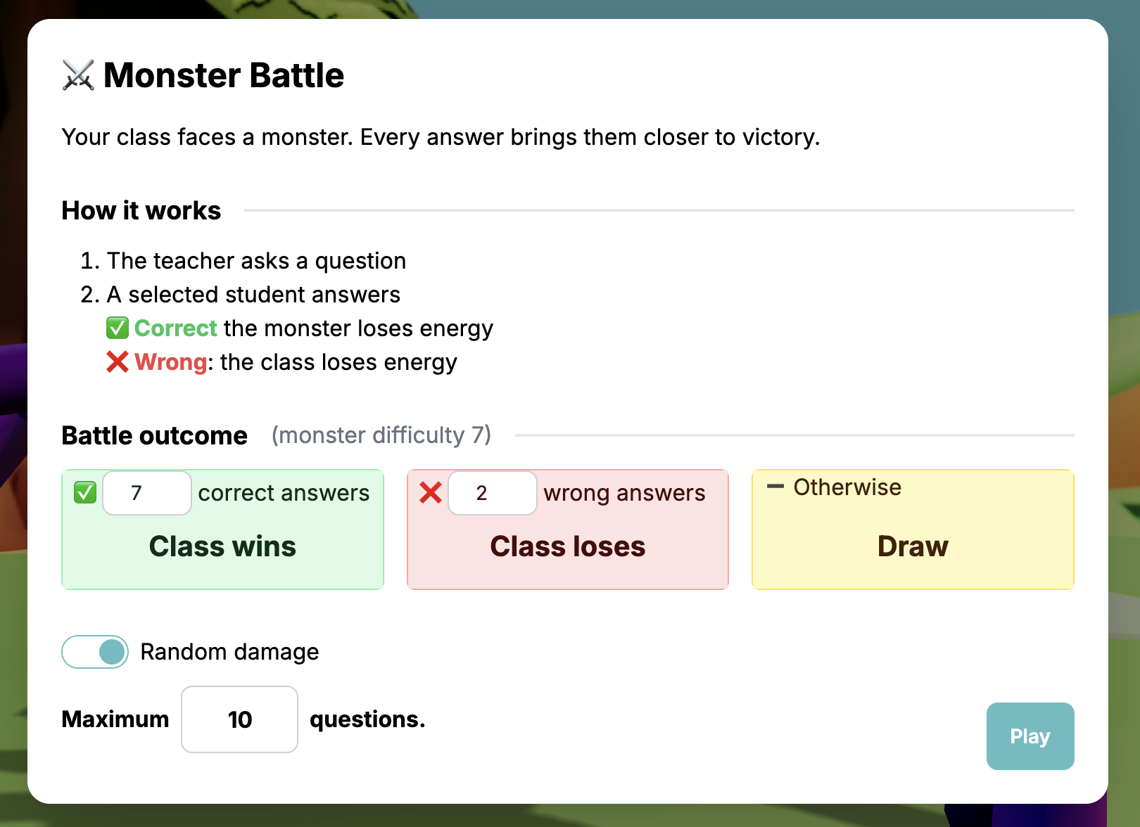 Briesmonis Kauja ir interaktīva klases spēle, kurā skolēni cīnās ar 3D animētiem briesmošiem, atbildot uz jautājumiem. Skolotāji kontrolē norisi, vērtē atbildes un apbalvo skolēnus par pareizām atbildēm. Kad skolēni atbild pareizi, briesmonim tiek nodarīts kaitējums. Kad viņi atbild nepareizi, klase zaudē enerģiju!