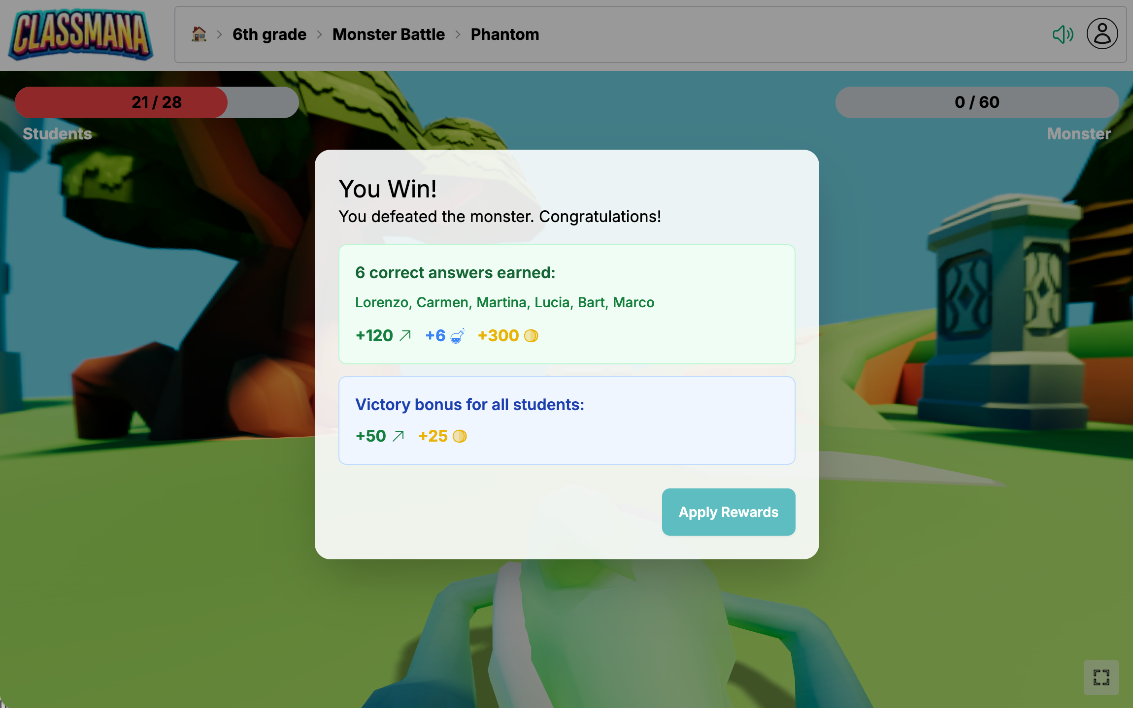 Noklikšķiniet Piemērot Apbalvojumus, lai pievienotu visus apbalvojumus skolēnu profiliem. Aktivitāšu žurnāla ieraksti tiek izveidoti automātiski ar komentāriem, piemēram, "Briesmonis Kauja Pareiza Atbilde" vai "Briesmonis Kauja Uzvaras Bonuss".